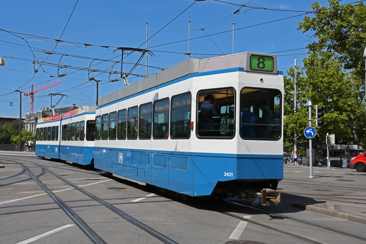 Doppeltraktion, mit dem Be 4/6 2083 und dem Be 2/4 2401, auf der Linie 8, verlässt am 22.08.2024 die Haltestelle Bellevue. Aufnahme Zürich.