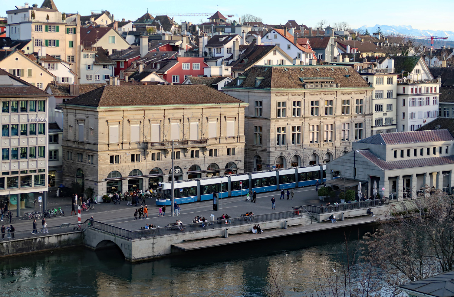 Ein Flexity (Be 4/8) der Linie 4 in Zürich, Rathaus am 30.12.2023.