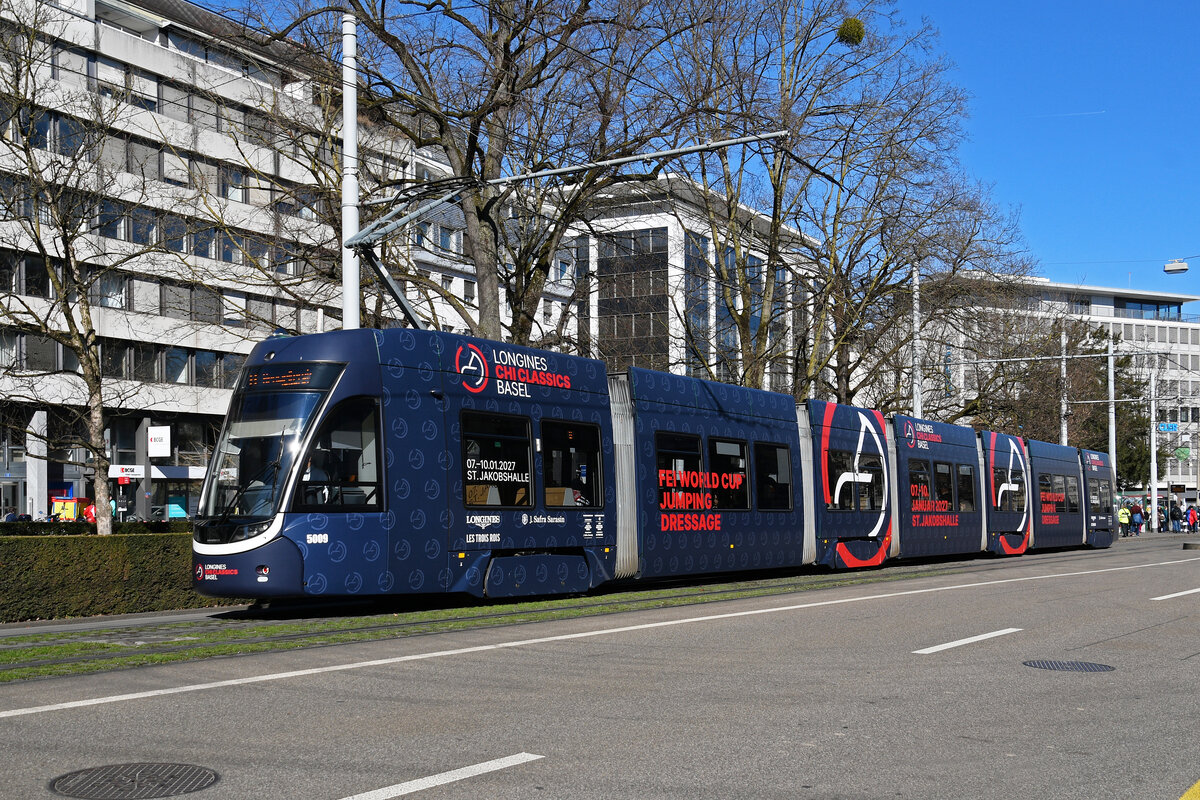 Be 6/8 Flexity 5009 mit der Werbung für einen Pferdeanlass in der St. Jakobs Halle, auf der Linie 8, fährt am 25.02.2026 zur Haltestelle am Bahnhof SBB. Aufnahme Basel. Markus Wagner