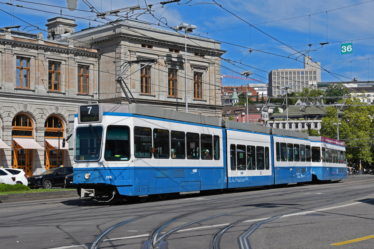 Doppeltraktion, mit dem Be 4/8 2106 und dem Be 2/4 2421, auf der Linie 7, fährt am 22.08.2024 zur Haltestelle beim Bahnhofplatz in Zürich.