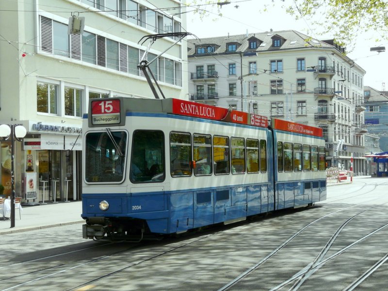 VBZ - Tram Be 4/6 2034 unterwegs auf der Linie 15 in der Stadt Zürich am 26.04.2009