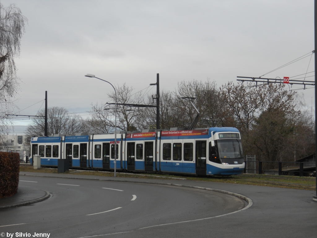 VBZ Nr. 3058 (Be 5/6 Cobra) am 11.12.2010 beim Auzelg. Am Einweihungstag der Linie 12 ging vergessen, dass hier vor 4 Jahren die 1. Etappe der Glattalbahn (Hallenstadion - Auzelg) eröffnet wurde, und den Grundstein für eines der erfolgreichsten ÖV-Konzepte der letzten Jahren legte.