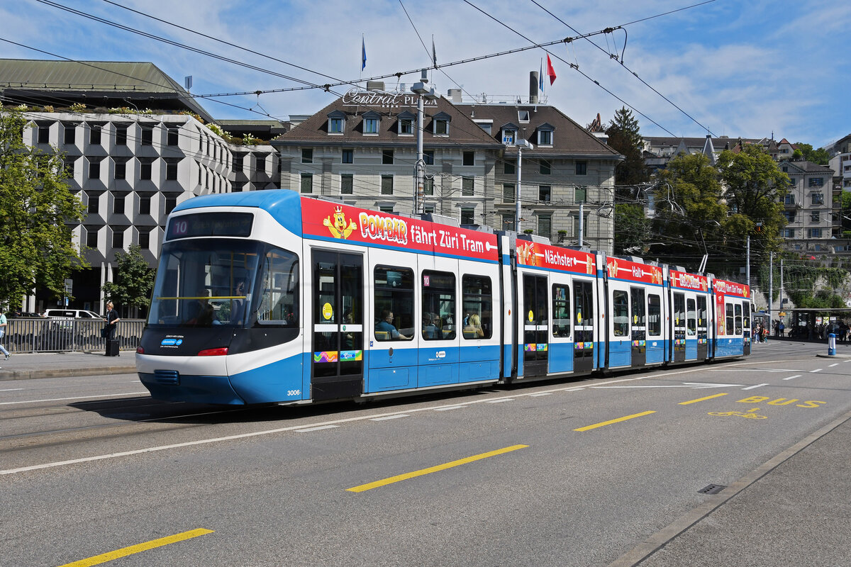 Be 5/6 Cobra 3006, auf der Linie 10, überquert am 22.08.2024 die Bahnhofbrücke in Zürich.