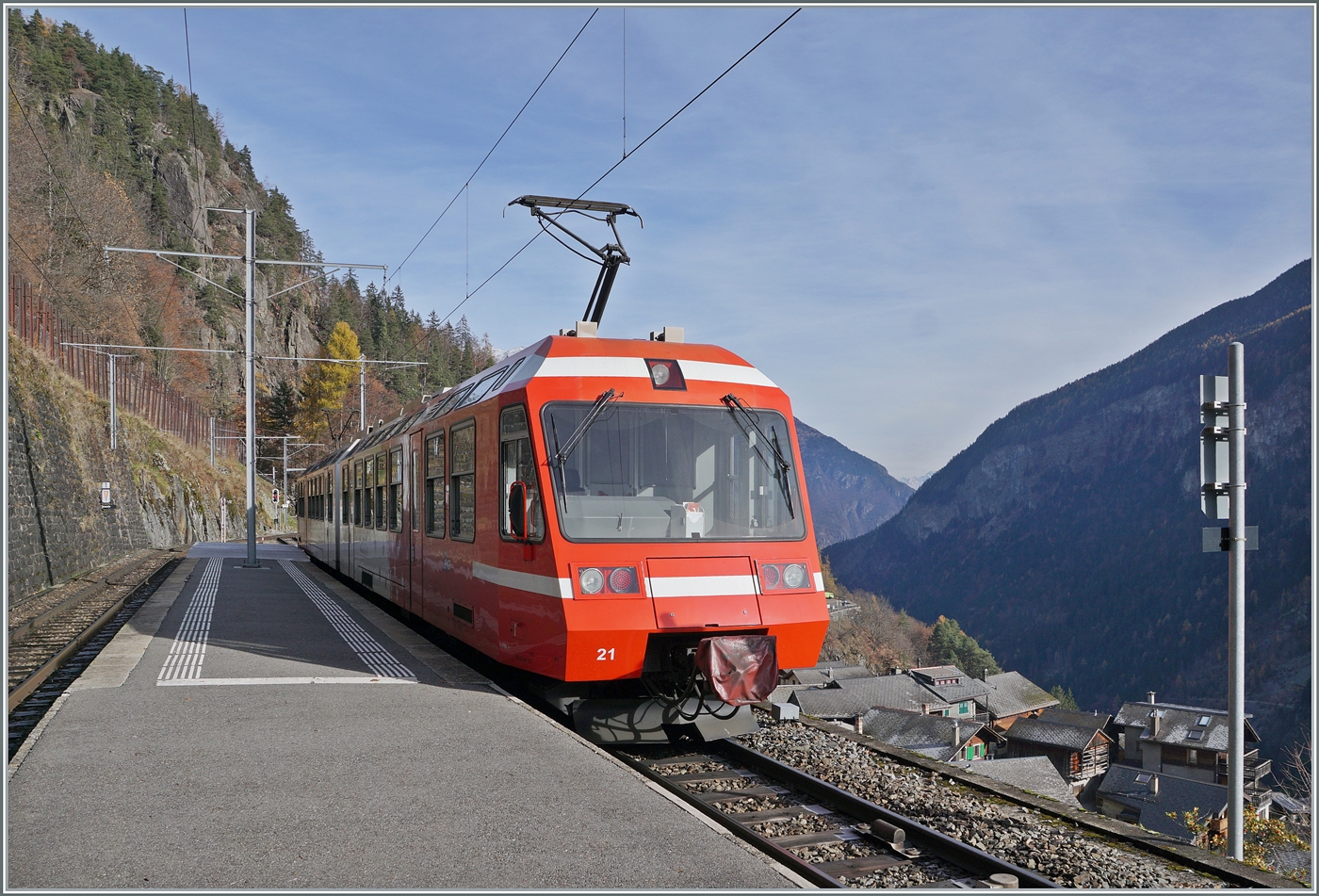 Noch einmal ein Bild des neuen SNCF TMR Z890 / Beh 4/8 (UIC 90 85 838 0892) bei seiner Probefahrt in Finhaut, diesmal aus einer etwas anderen Perspektive, welche die hohen Bahnstiege der M-C zeigt. Die Hhöhe der Bahnsteige wurde wohl gewählt, um die Reisenden davon abzuhalten, die Gleise zu überschreiten und dabei die Stromschien zu berühren.