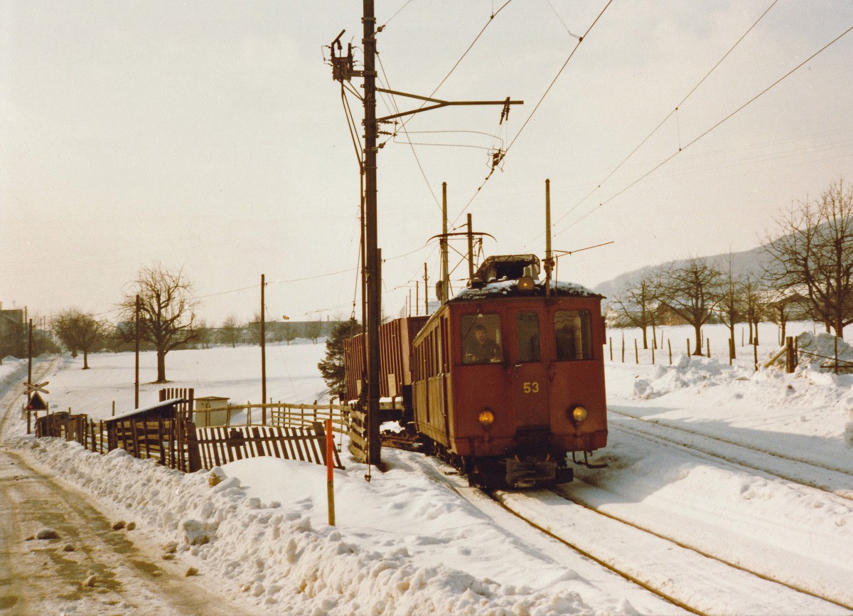 ASm/OJB: Der De 4/4 53, 1917 (ehemals LMB CFe 4/4 6) brachte an einem Wintertag im Februar 1980 einen Kehrichtwagen auf Rollschemel von Langenthal nach Niederbipp. Die Aufnahme entstand kurz vor der Endstation Niederbipp.
