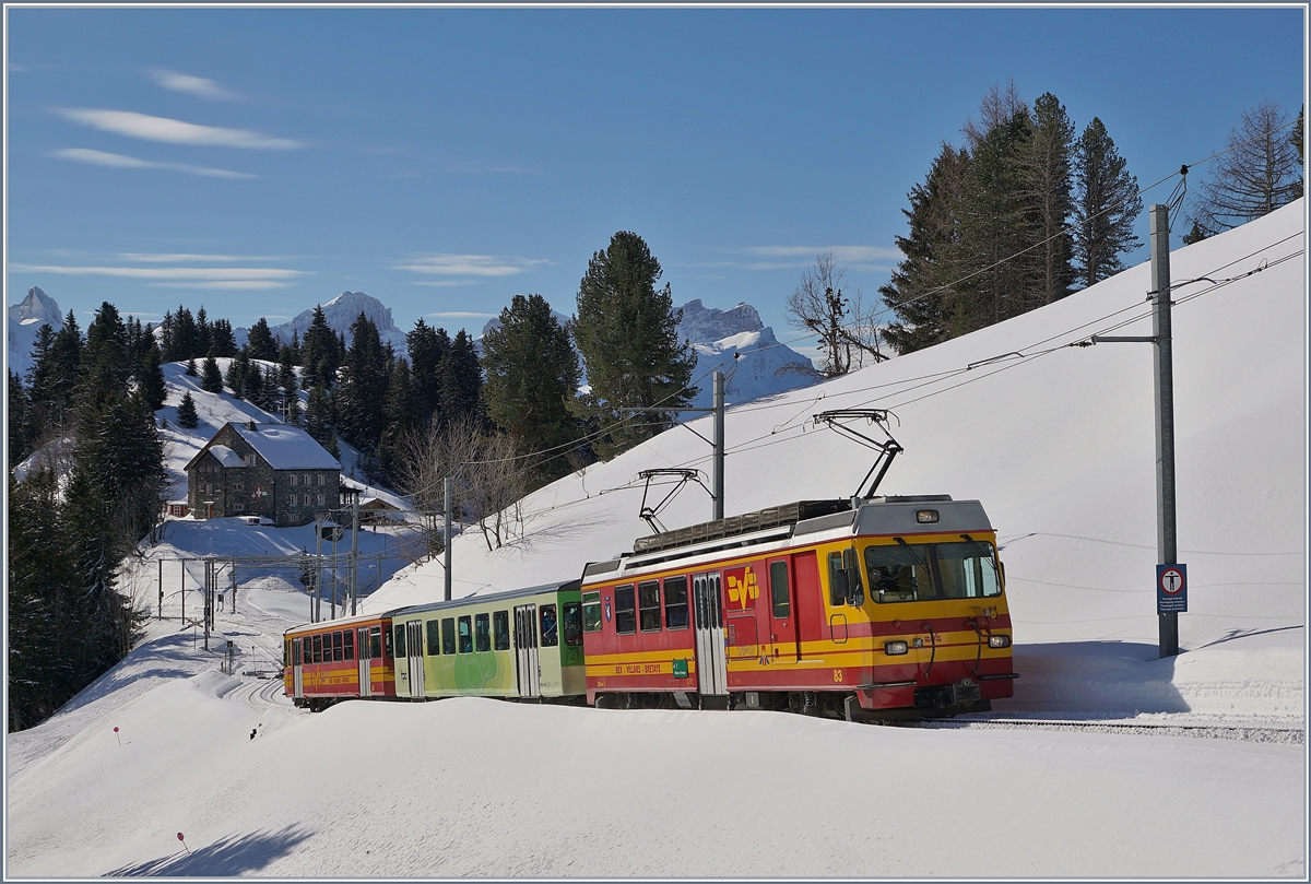 Der TPC BVB BDeh 4/4 83 ist mit einem Reisezug kurz nach der Station Bouquetins auf dem Weg zum Col de Bretaye, wo der Zug in ein paar Minuten eintreffen wird.