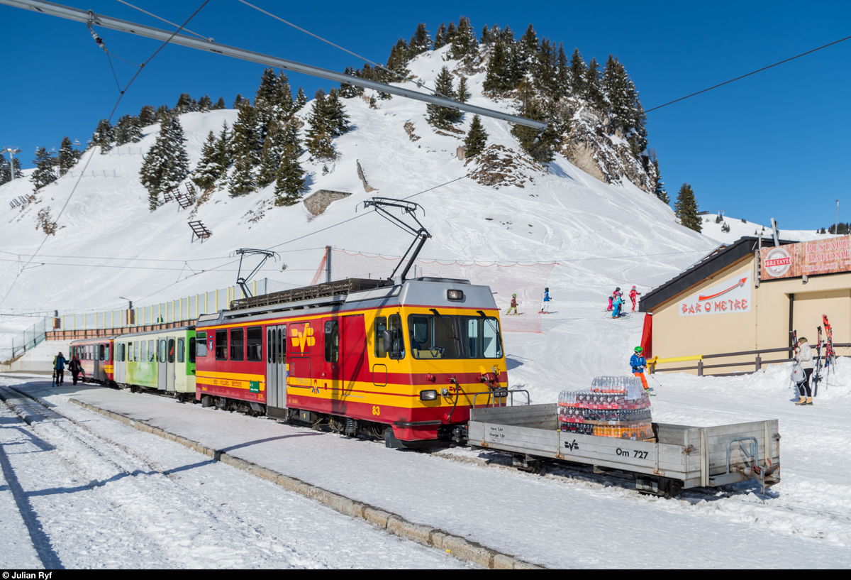 BDeh 4/4 83 hat am 17. Februar 2016 soeben den Col de Bretaye erreicht. Auf dem Vorstellwagen befindet sich Getränkenachschub für eines der zahlreichen Bergrestaurants.