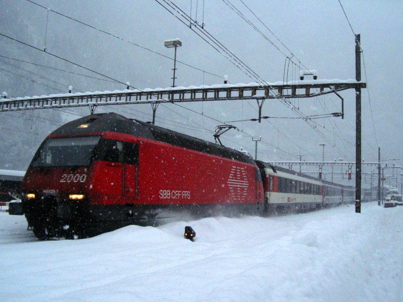 Die SBB Re 460 010 "Swiss Tainable" ist in Airolo mit ihrem IC 2 10874 auf dem Weg von Lugano nach Zürich HB. 21. Januar 2025