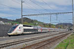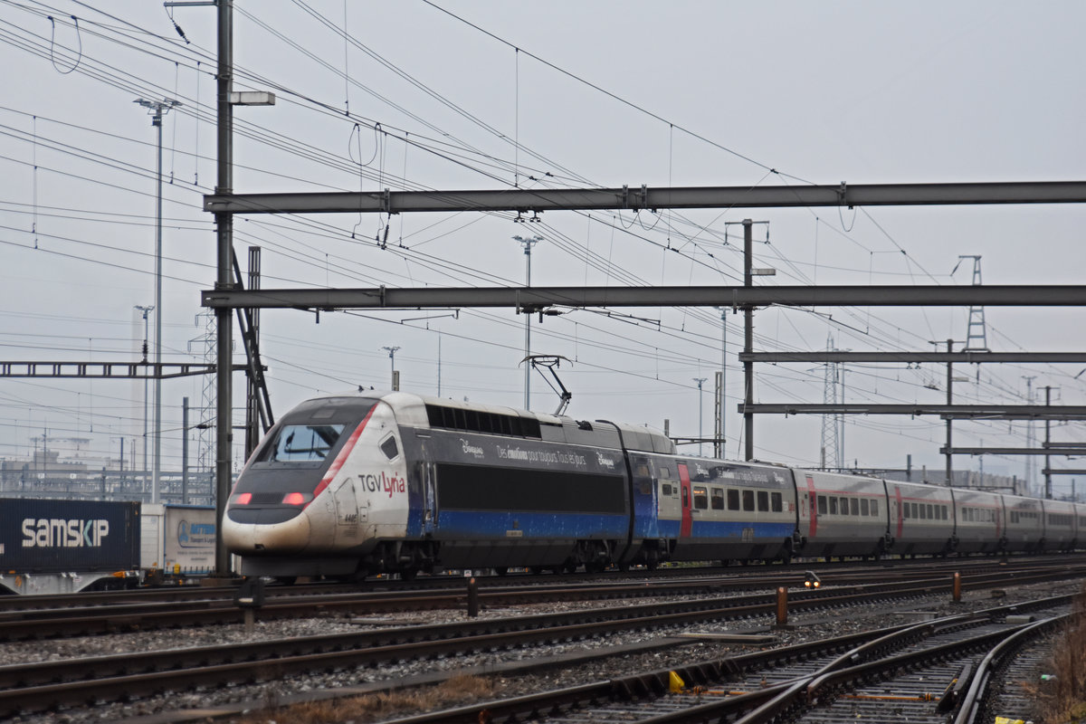 TGV Lyria 4405 mit einer Disney Werbung durchfährt den Bahnhof Muttenz. Die Aufnahme stammt vom 16.12.2018.