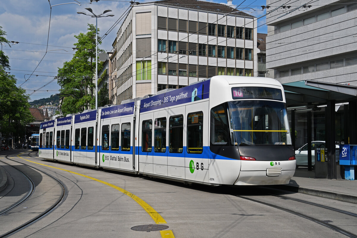 VBG - Tram Be 5/6 3074 unterwegs auf der Linie 12 bei der Haltestelle vor dem Flughafen Zürich am 12.02.2023