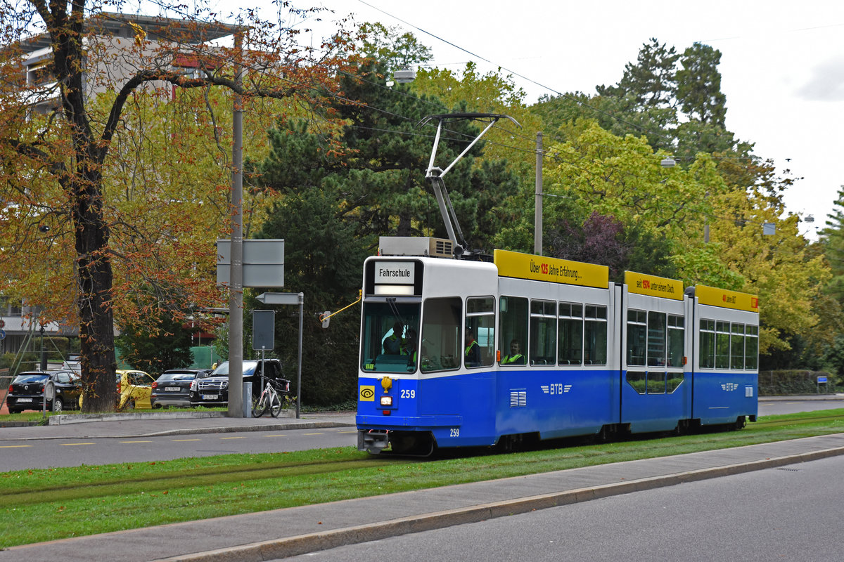 Be 4/8 259 Im BTB Look fährt mit der Fahrschule bei der Haltestelle Grosspeterstrasse ein. Die Aufnahme stammt vom 07.10.2019.