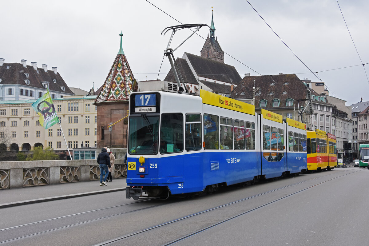 Doppeltraktion, mit dem Be 4/8 259 im BTB Look zusammen mit dem Be 4/6 201, auf der Linie 17, überquert die Mittlere Rheinbrücke. Die Aufnahme stammt vom 02.04.2022.