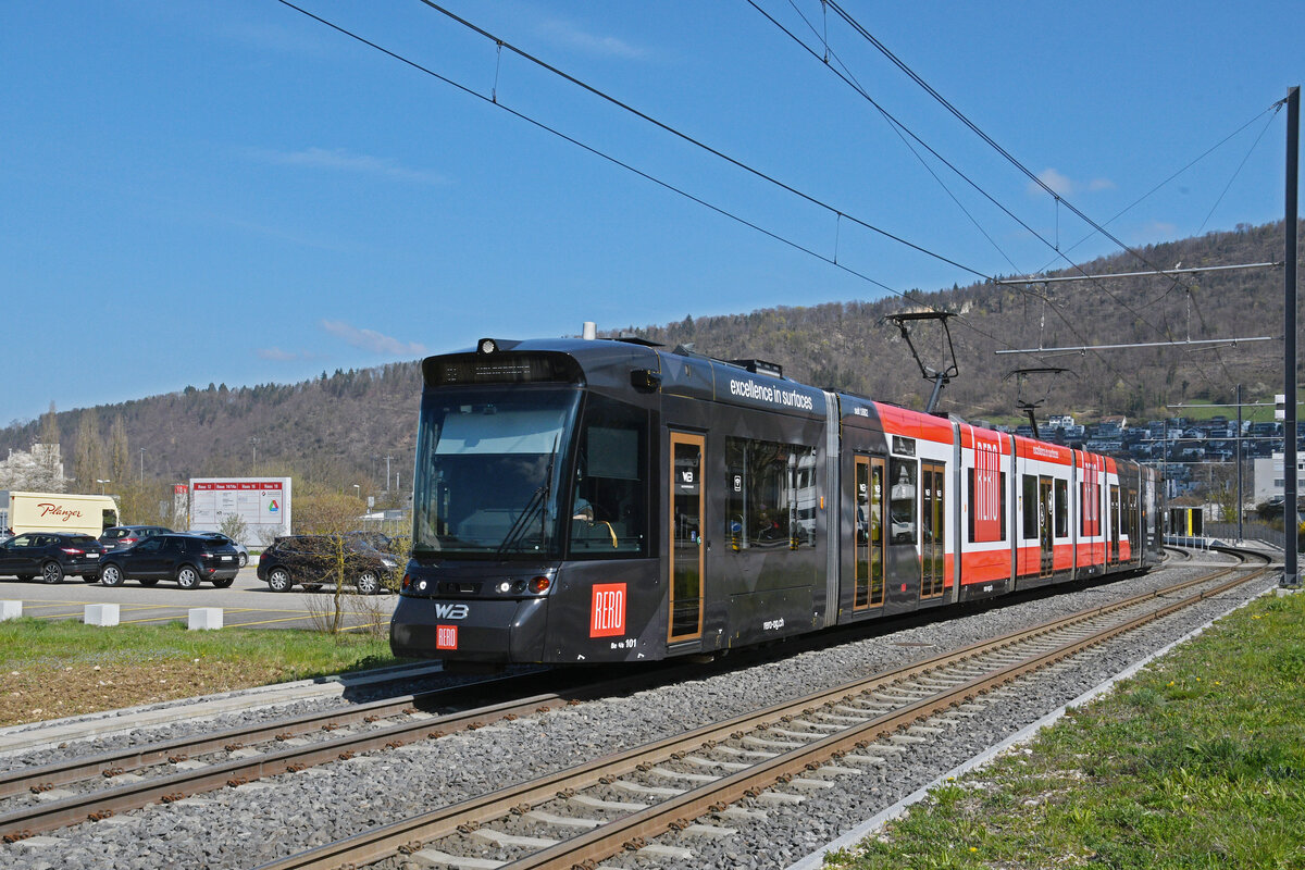 Be 6/8 Tramlink 101 mit der RERO Werbung, auf der Linie 19, verlässt am 02.04.2026 die Haltestelle Gräubern. Aufnahme Liestal.