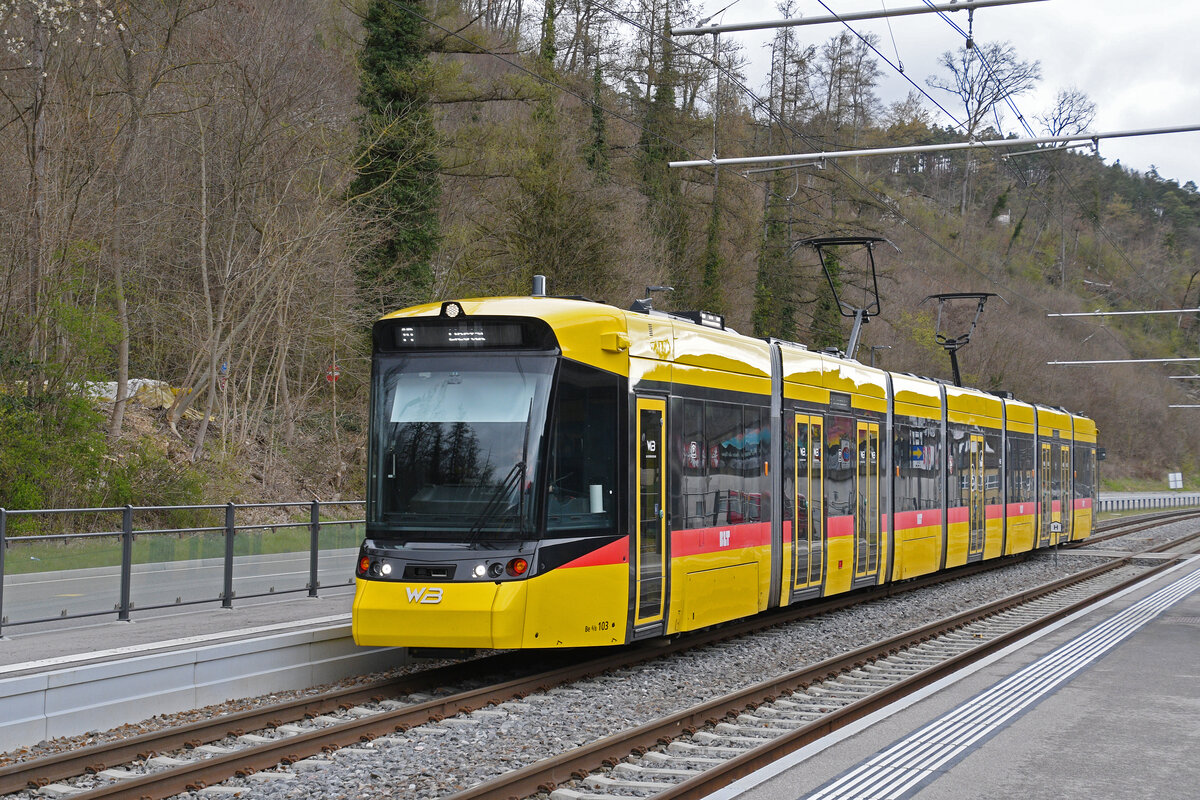Be 6/8 Tramlink 103, auf der Linie 19, fährt am 30.03.2026 bei der Haltestelle Lampenberg-Ramlinsburg ein. Aufnahme Bad Bubendorf.