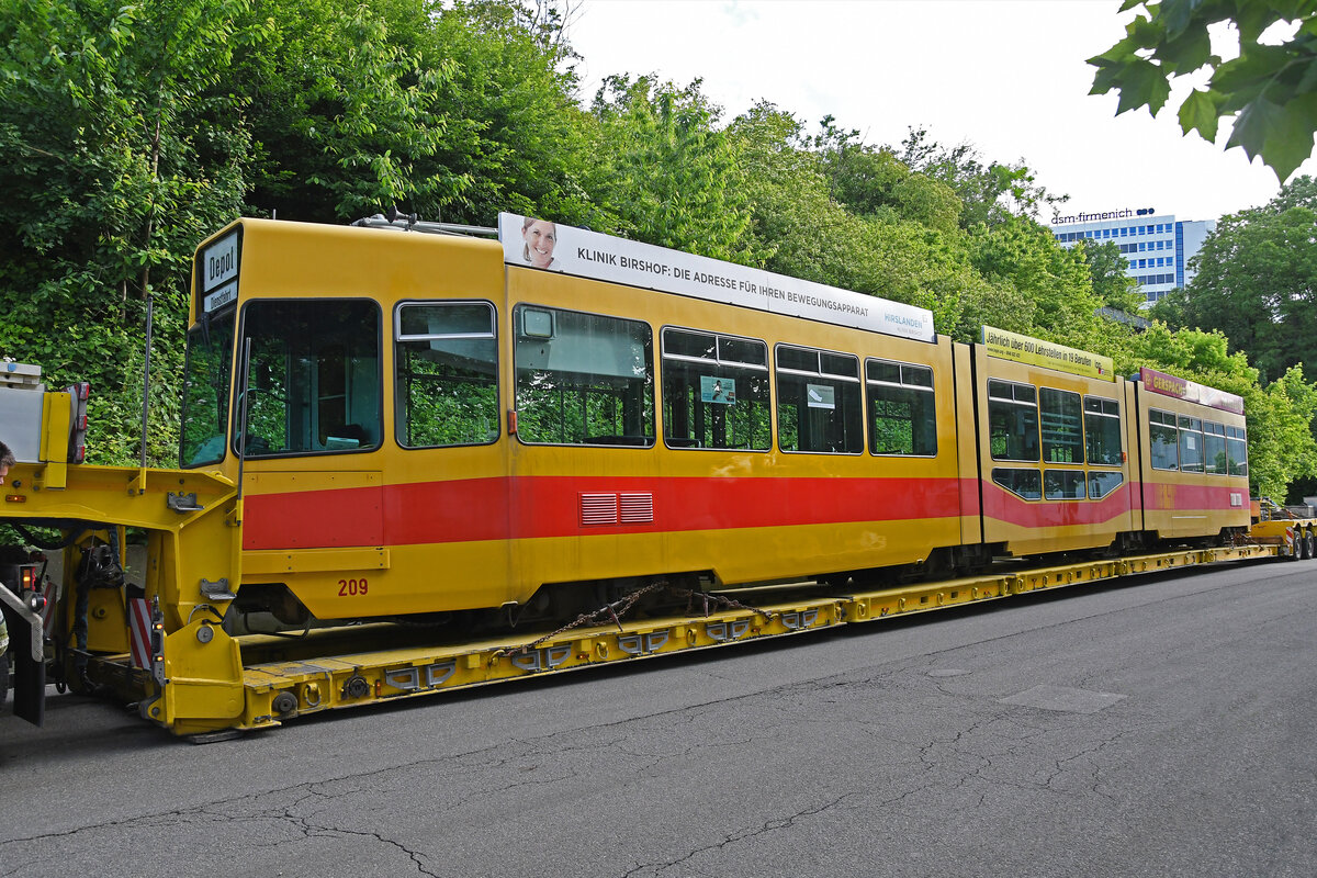 Für den Be 4/8 209 hat bald die letzte Stunde geschlagen. Am 23.05.2024 steht der Wagen vor dem Tor zur Firma Thommen und wartet auf sein Ende.