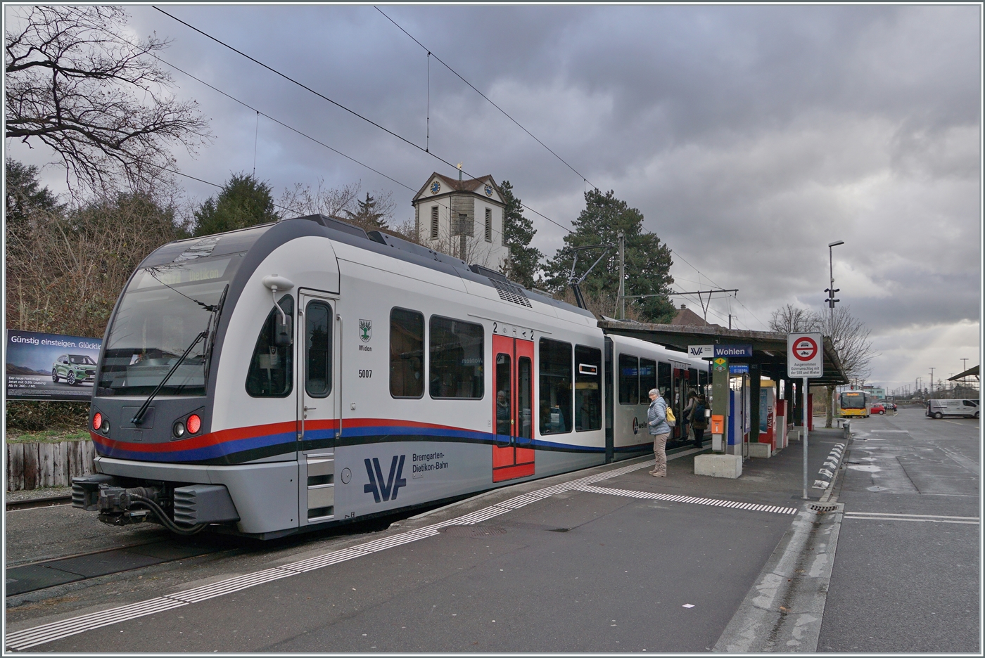 An der gleichen Stelle, viele Jahre später, warten in Wohlen zwei AVA BDWM ABe 4/8 "Diamant" auf die Abfahrt als S17 nach Dietkion. Die schon 1984 bescheiden Gleisanlage hat sich in der Zwischenzeit kaum verändert. 6. Dezember 2024