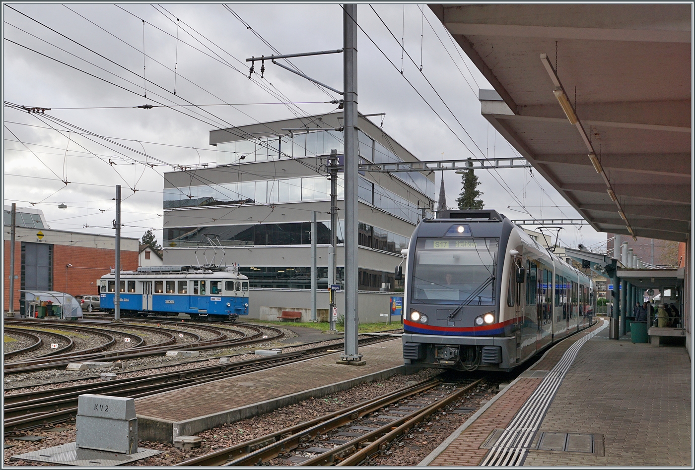 An der gleichen Stelle, viele Jahre später, warten in Wohlen zwei AVA BDWM ABe 4/8  Diamant   auf die Abfahrt als S17 nach Dietkion. Die schon 1984 bescheiden Gleisanlage hat sich in der Zwischenzeit kaum verändert.