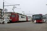 Sehr interessante Zugskreuzung in Bannwil zwischen dem SNB BDe 4/5 5 (Kehrichtzug Niederbipp-Langenthal) und dem OJB Be 4/4 80, ehemals BA, mit dem OJB B2 11, ehemals LJB.
