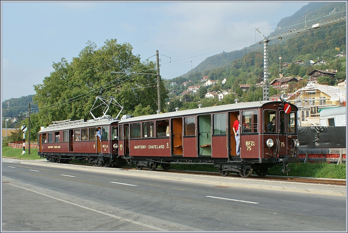 Der schiebende Martigny-Châtelard Pendelzug BCFeh 4/4 N° 15 von seinem Steuerwagen BFZt4 N° 75 aus bedient verlässt Blonay in Richtung Chamby. Der damals 100 Jährige Zug war im Rahmen der Themenveranstaltung  Le Valais en fête sur la BC  bei der Blonay-Chamby Bahn. Heute ist der Zug ist im Besitz der TNT, welche ihn zur Zeit einer aufwändigen Revision unterzieht. 26. September 2009