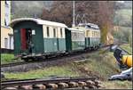 Nur noch als "Rest" vorhanden war Wagen ABDeh 4/4 Nr.3 (frühere Schweizer Privatbahn SGA, Gais, Schweiz, 12.02.1986)