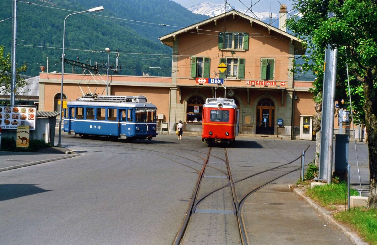 BVB BDeh 2/4 Nr. 24 wartet auf Fahrgäste. Bahnhofplatz in Bex, Dez. 1991, HQ-Scan ab Dia.