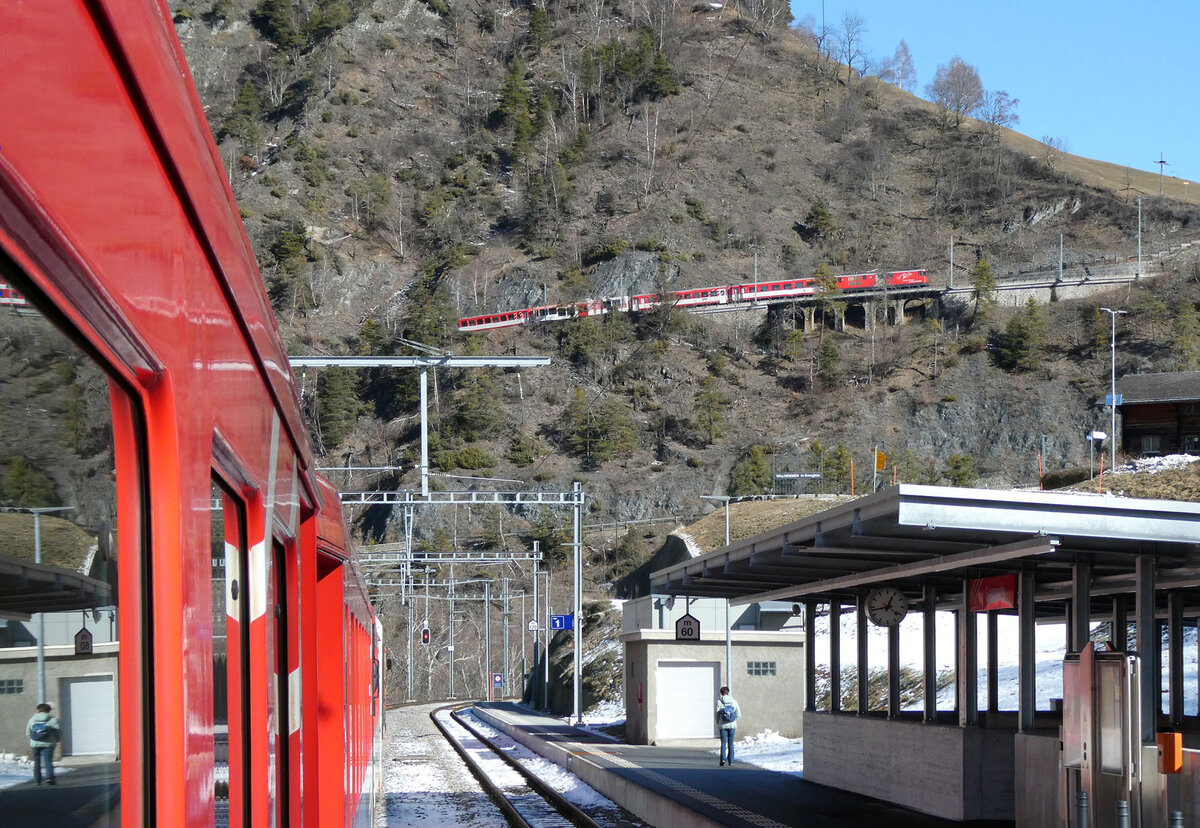 Grengiols: wir warten auf den Gegenzug, der sich auf dem Zahnstangenabschnitt kurz vor dem Bahnhof befindet. Vor der Einfahrt in den Bahnhof befährt er noch ein Kehrtunnel. Grengiols, 13.02.2026 Markus Gmür