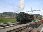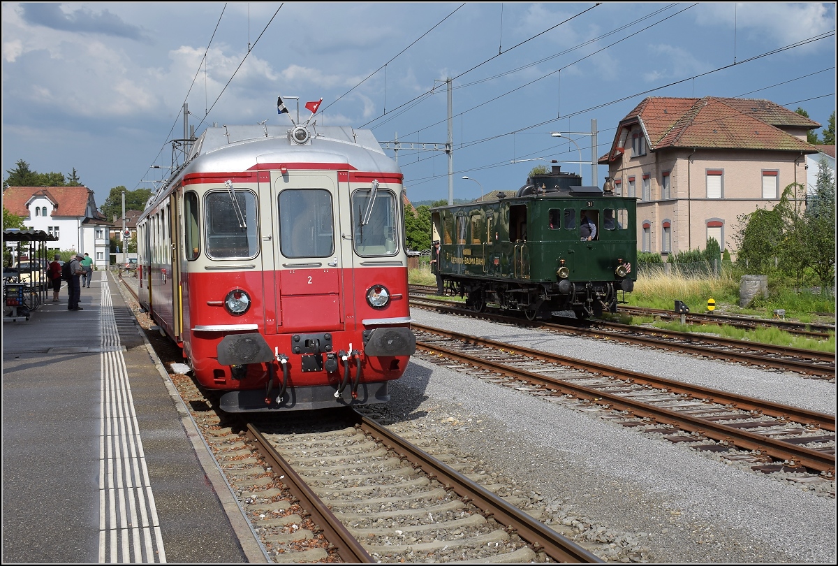 Triebwagentreffen Koblenz, August 2017. Am Bahnsteig in Laufenburg wartet der EAV-Triebwagen der WM, BDe 4/4 2 auf seine Fahrgäste, während im Hintergrund der letzte Mohikaner, Kittel-Dampftriebwagen Czm 1/2 der UeBB, rangiert.