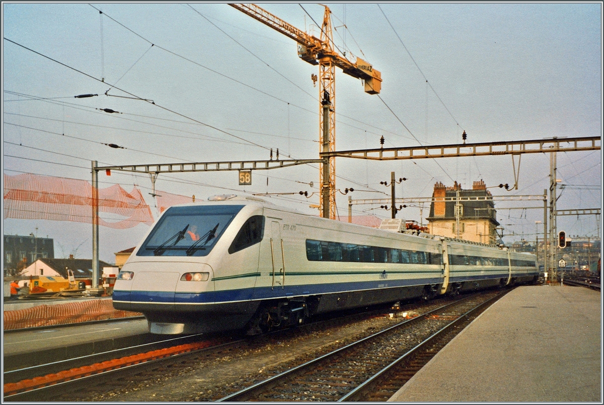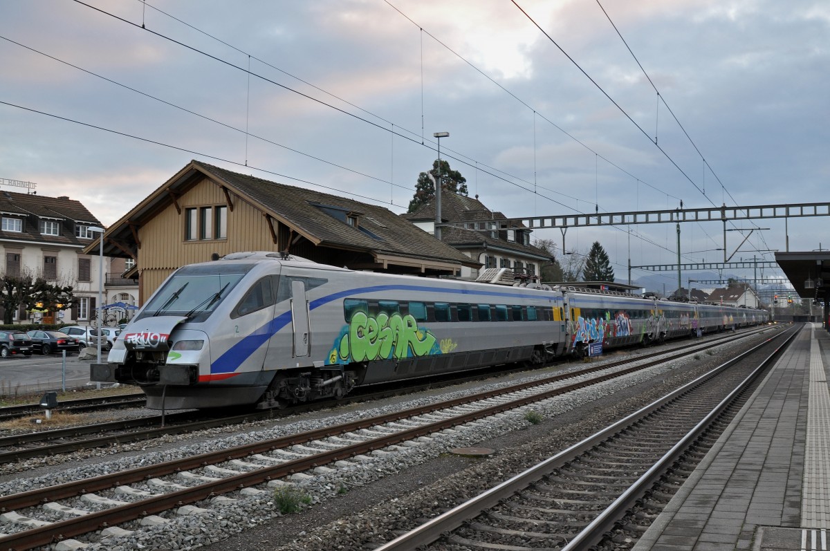 Der ETR 470 003 ist abgebrochen. Nun kommt der ETR 470 002 an die Reihe. Er steht jetzt beim Bahnhof Kaiseraugst. Die Aufnahme stammt vom 26.11.2015.