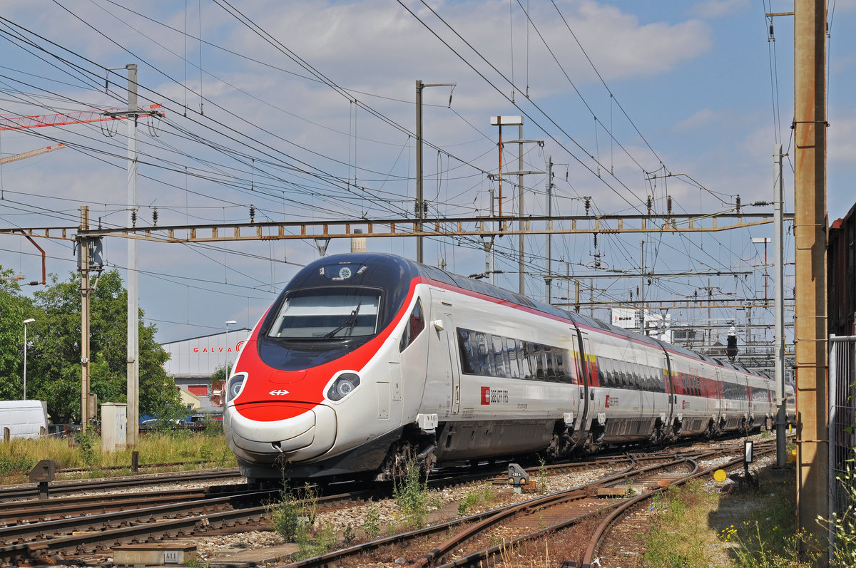 ETR 610 durchfährt den Bahnhof Pratteln. Das abzweigende Gleis führt auf eine Strasse und in ein Industriegebiet, von wo aus auch diese Aufnahme am 16.07.2016 entstand.