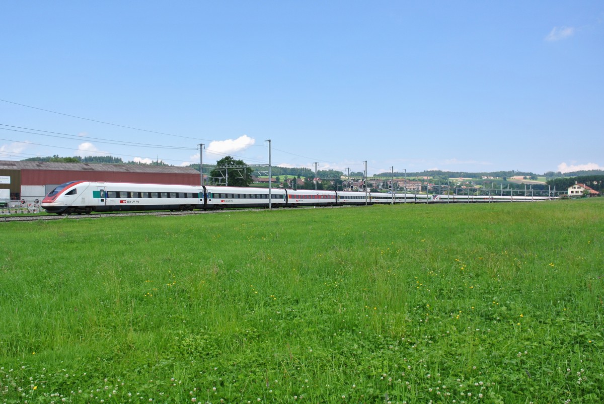 Heute kam es zu einem äusserst seltenen Einsatz eines ICN zwischen Bern und Lausanne. Die beiden ICN 500 017-9 und 500 008-8 (Refit) pendelten heute den ganzen Tag als IC 7xx zwischen Genf und St. Gallen. Diese Züge sind normalerweise nicht auf diesem Abschnitt anzutreffen, IC 720 kurz nach Romont, 01.08.2014.