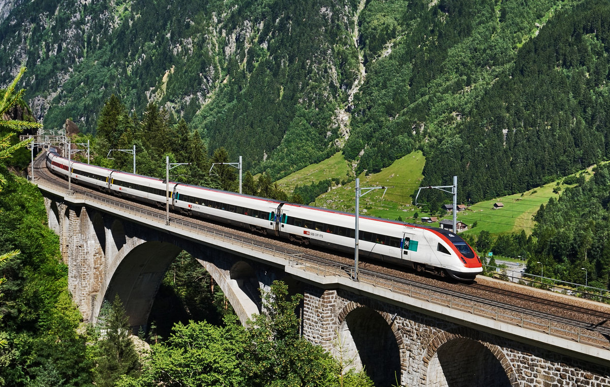 Ein RABDe 500 überquert als ICN 684 (Lugano - Basel SBB), die mittlere Meienreussbrücke bei Wassen.