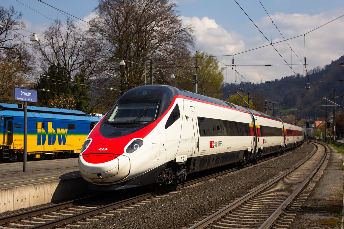 Rein RABe 510 durchfährt Dornbirn. Aufgrund der Bauarbeiten in Bregenz startet der Railjet erst ab Dornbirn. 20.4.21