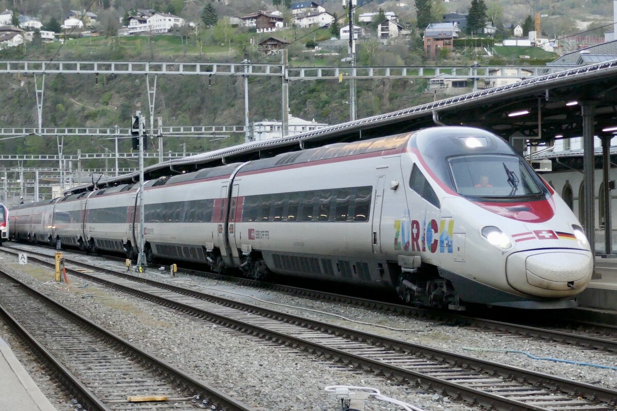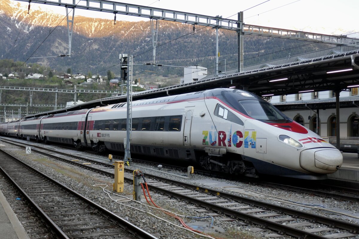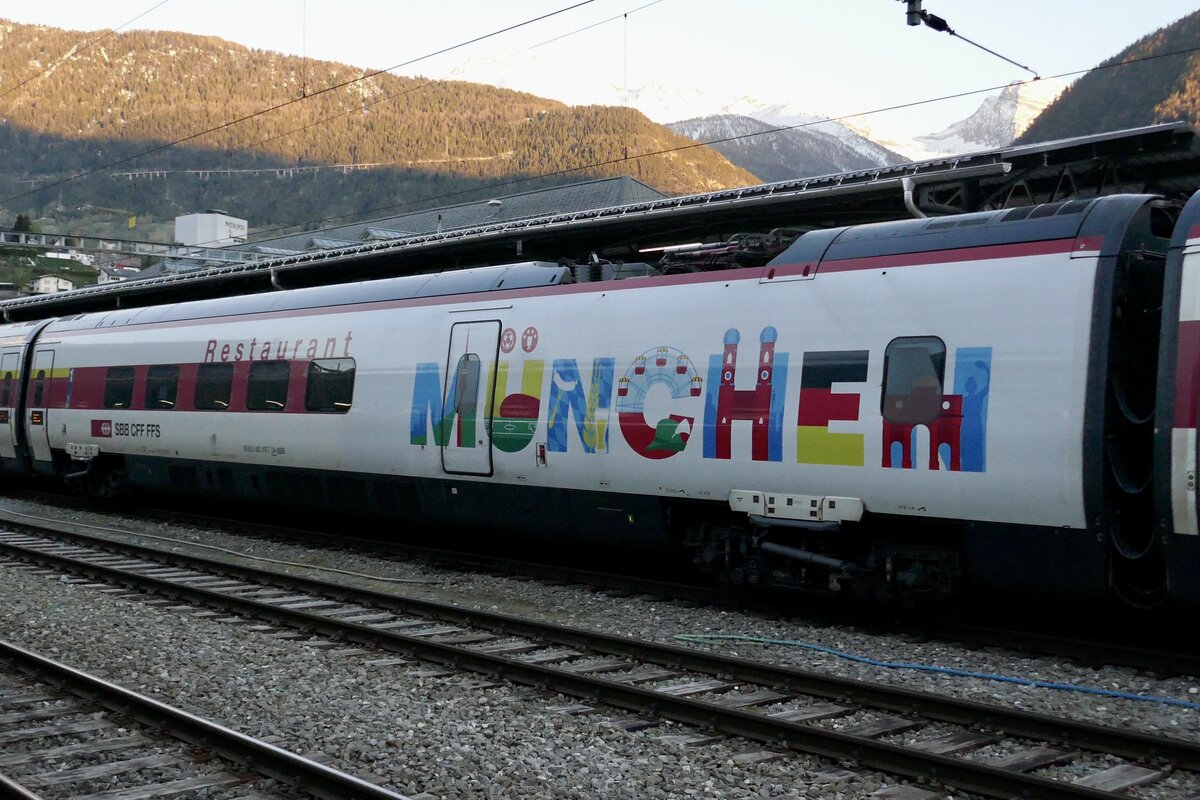Der RABe 503 018 mit der "Zürich - München" Beklebung am 8.4.26 im Bahnhof Brig.
