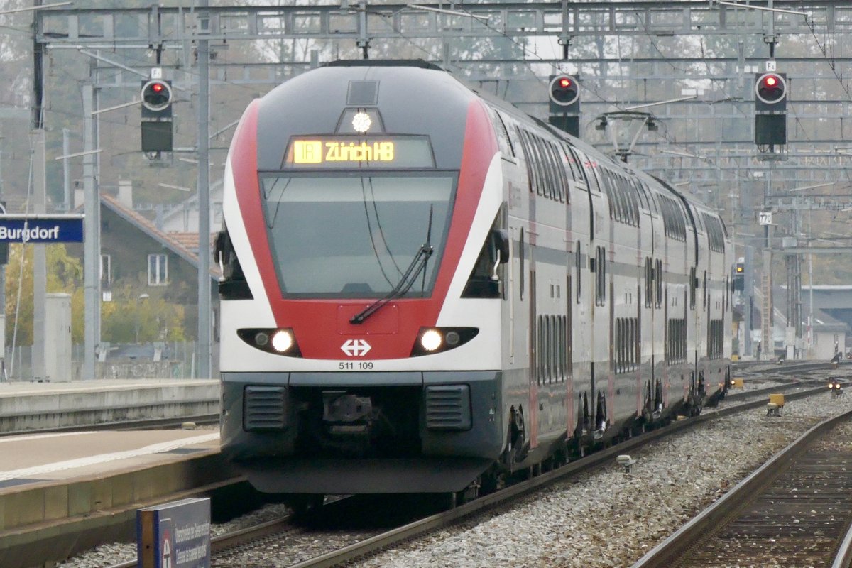 RABe 511 109 als IR 17 nach Zürich HB erreicht am 4.11.18 den Bhf Burgdorf.