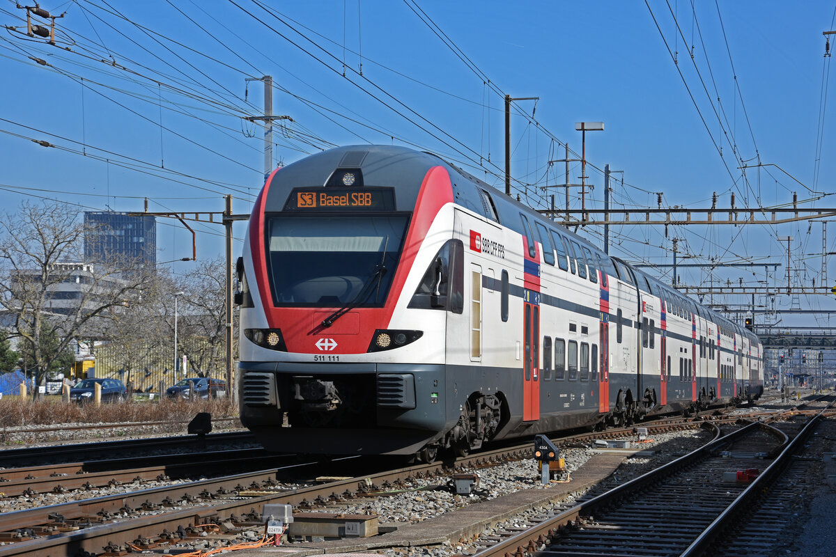 RABe 511 111 KISS, auf der S3, verlässt den Bahnhof Pratteln. Die Aufnahme stammt vom 03.03.2022.