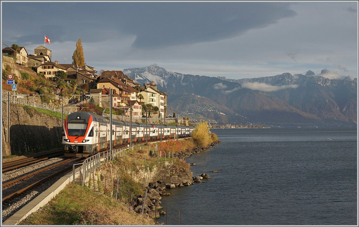 Ein RE 33 mit dem SBB RABe 511 113 an der Spitze ist zwischen St-Saphorin und Rivaz auf dem Weg nach Annemasse. 12. November 2024