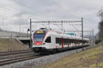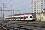 RABe 521 017, mit der Werbung für die Fachhochschule Muttenz, auf der S1, fährt Richtung Bahnhof SBB. Die Aufnahme stammt vom 25.01.2018.