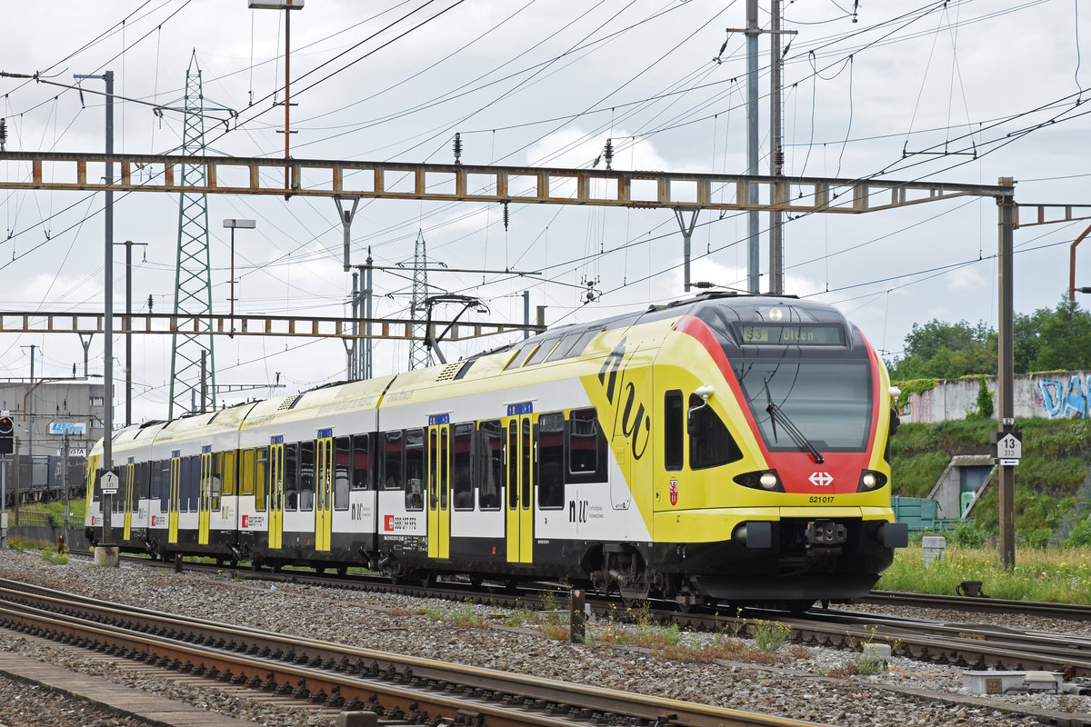 RABe 521 017, mit der Werbung für die Fachhochschule Muttenz, fährt am 21.06.2018 zum Bahnhof Pratteln. Die Aufnahme stammt vom 12.06.2018.