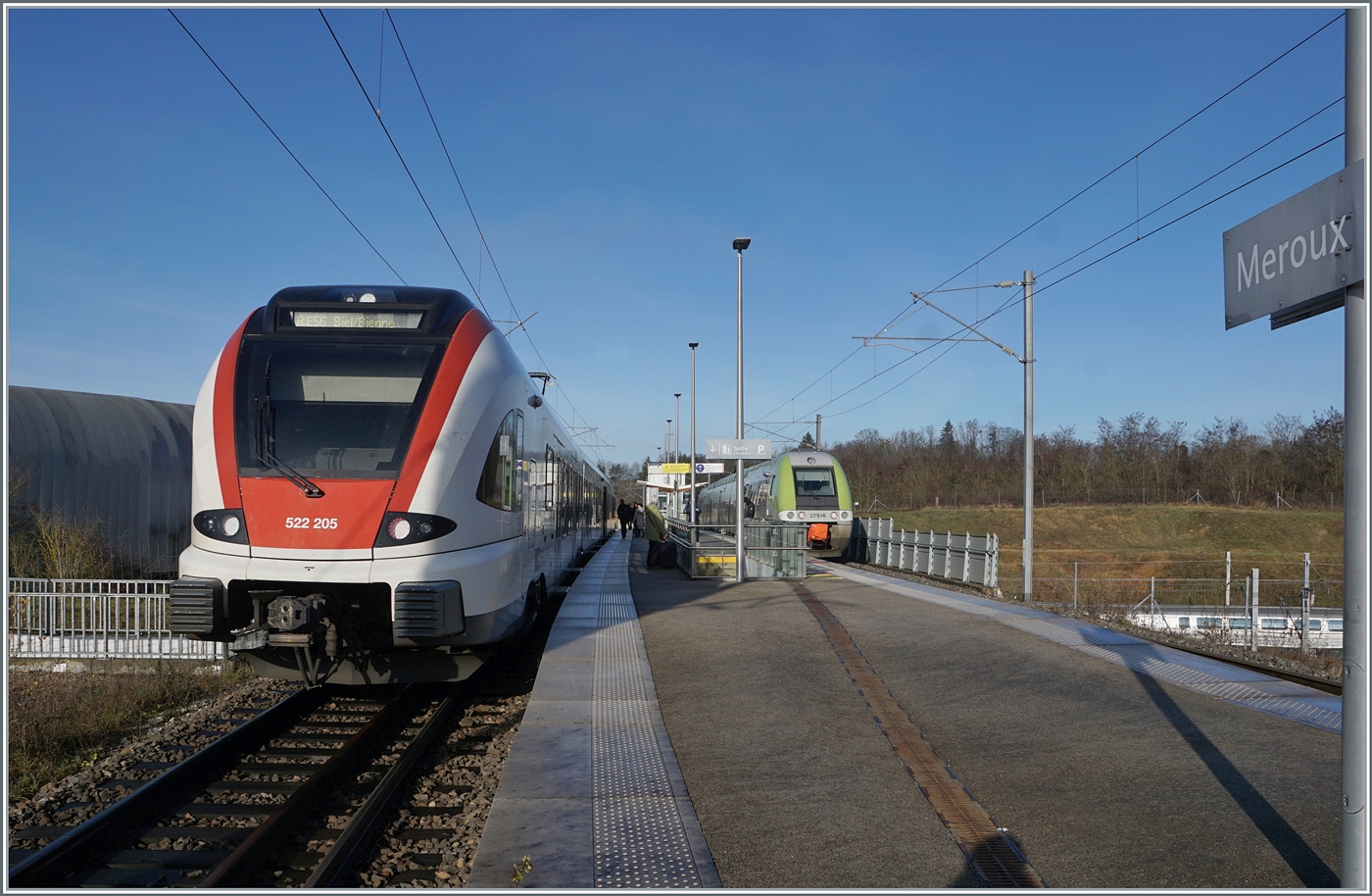 RABe 522 208, auf der S3, verlässt den Bahnhof Pratteln. Das abzweigende Gleis führt auf eine Strasse und in ein Industriegebiet, von wo aus auch diese Aufnahme am 21.03.2017 entstand.