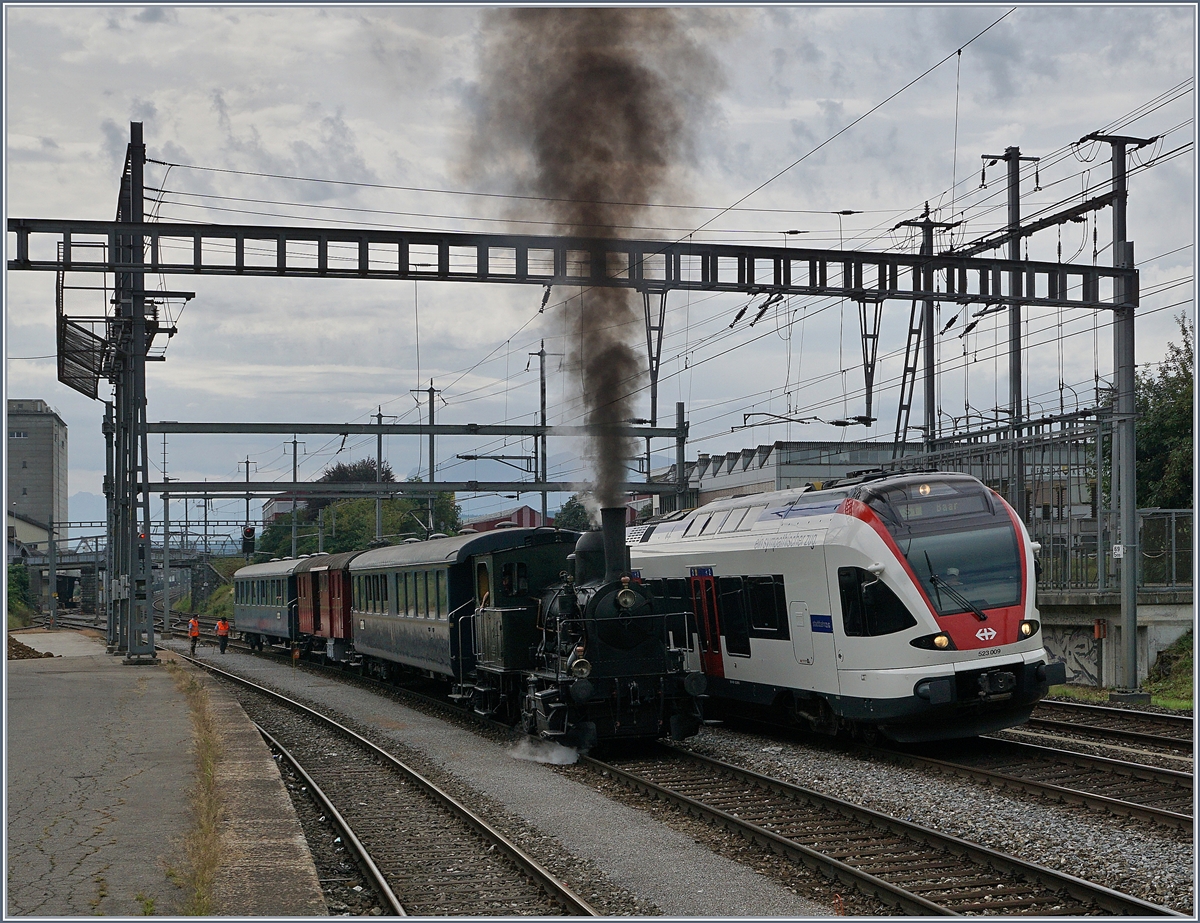 Regionalverkehr gestern und heute: Während die ST E 3/3 N° 3 mit ihrem Zug auf ein freies Bahnsteiggleis in Sursee wartet, fährt auf dem Nebengleis ein SBB RABe 523 009 ein, der in Sursee wendet und nach Baar zurück fahren wird.