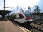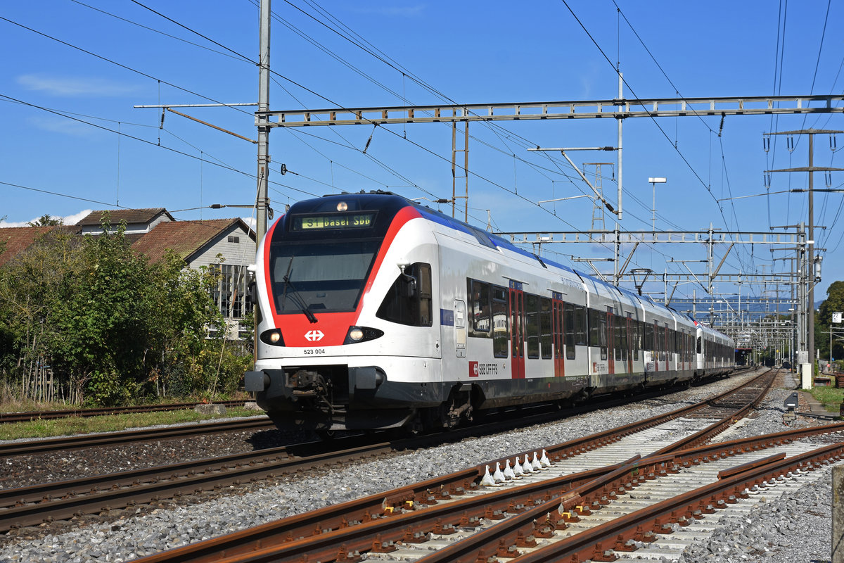 RABe 523 004, auf der S1, verlässt den Bahnhof Rheinfelden. Die Aufnahme stammt vom 15.09.2018.