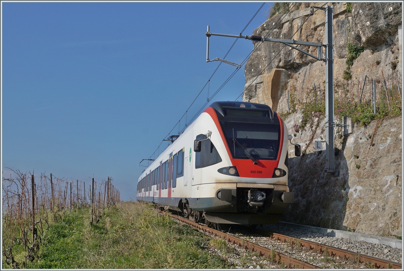 Eng an das steil abfallende Gelände des Lavaux geschmiegt, verläuft das Trasse der  Train des Vignes  Strecke oberhalb von St-Saphorin. Das Bild zeigt den SBB RABe 523 028 als R7 von Palézieux nach Vevey zwischen Chexbres und Vevey bei Kilometer 3.896.