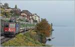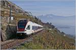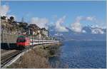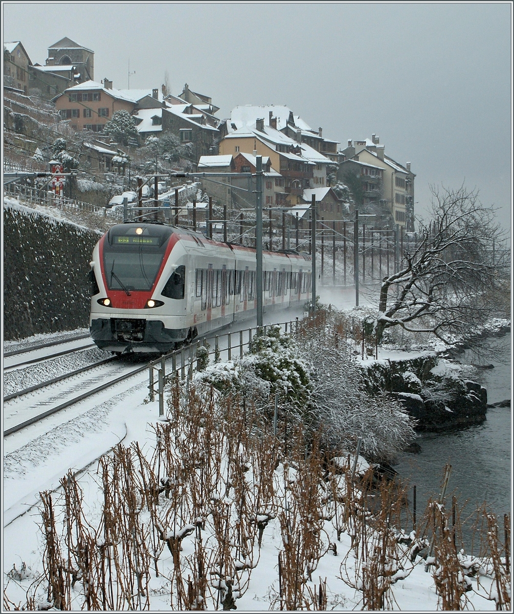 Winter - Schnee im Lavaux ist im Winter eher selten und ziert bei diesem Bild des SBB RABe 523 027 nicht nur St Saphorin im Hintergrund sehr vorteilhaft, sondern auch den Baum rechts im Bild.