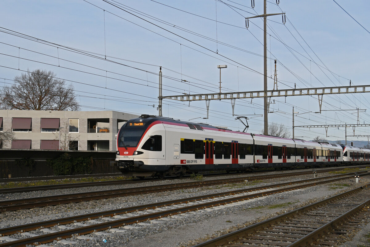 Doppeltraktion, mit den RABe 523 004 und 523 067, auf der S23,fährt am 23.03.2026 beim Bahnhof Rothrist ein.
