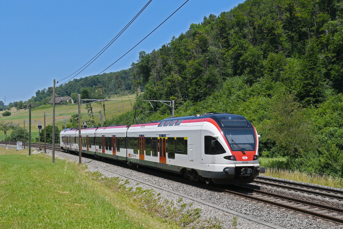 Eng an das steil abfallende Gelände des Lavaux geschmiegt, verläuft das Trasse der  Train des Vignes  Strecke oberhalb von St-Saphorin. Das Bild zeigt den SBB RABe 523 028 als R7 von Palézieux nach Vevey zwischen Chexbres und Vevey bei Kilometer 3.896.