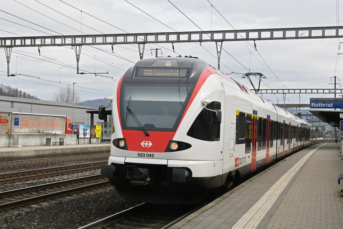 RABe 523 001-6 und RABe 523 033-4 nähern sich am 19.2.11 als S 26 ihrem Ziel Rotkreuz.