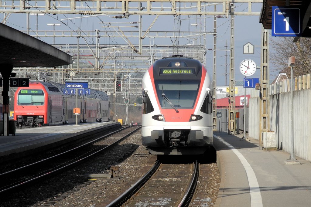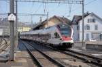 RABe 523 042, auf der S23, wartet am 15.09.2025 beim Bahnhof Rothrist.