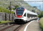Eng an das steil abfallende Gelände des Lavaux geschmiegt, verläuft das Trasse der  Train des Vignes  Strecke oberhalb von St-Saphorin. Das Bild zeigt den SBB RABe 523 028 als R7 von Palézieux nach Vevey zwischen Chexbres und Vevey bei Kilometer 3.896.