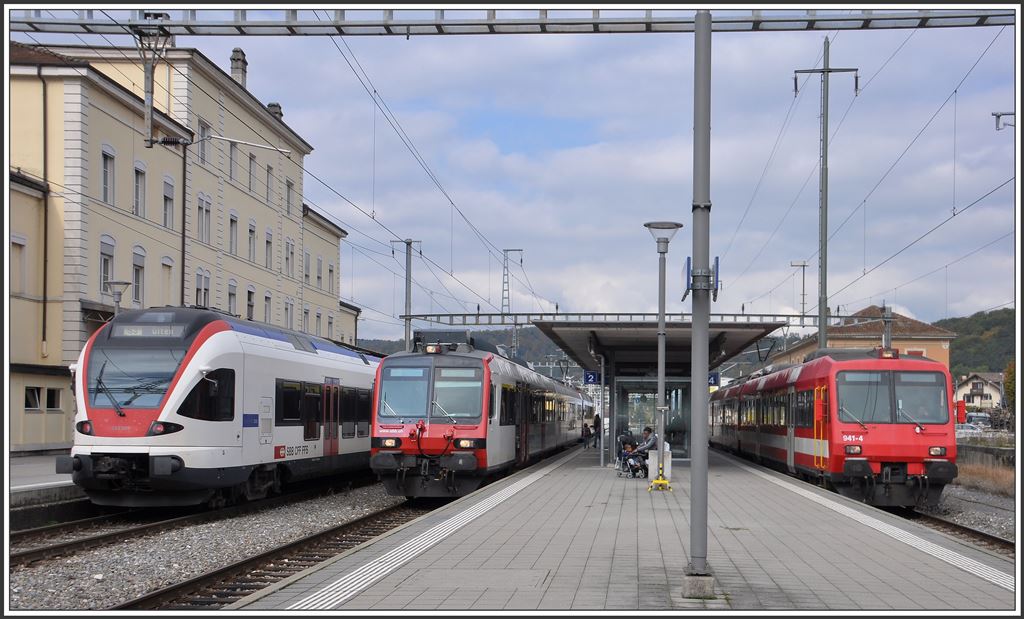 S3 17346 nach Basel und Olten, RE3178 nach Biel/Bienne und R26458 nach Bonfol treffen sich allesamt im Bahnhof Porrentruy.(09.10.2015)