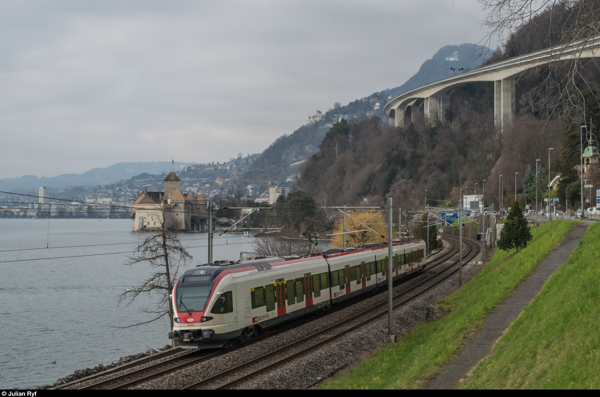Ein, bzw. zwei SBB RABe 523  FLIRT -Triebzüge auf dem Weg in Richtung Lausanne vor der Kulisse des Château de Chillon. Überraschenderweise sind seit dem Fahrplanwechsel 2025/26 auf diesem Streckenabschnitt die sonst so omnipräsenten FLIRTS kaum mehr zu sehen: RABe 512 als R1 und R2 verkehren nun von Grandson bis nach Bex, statt wie bisher nur nach Cully; und die R3 und R4 welche mit FLIRT RABe 523 verkehren, enden bzw beginnen ihre Fahrt nach Vallorbe oder Le Brassus in Vevey.